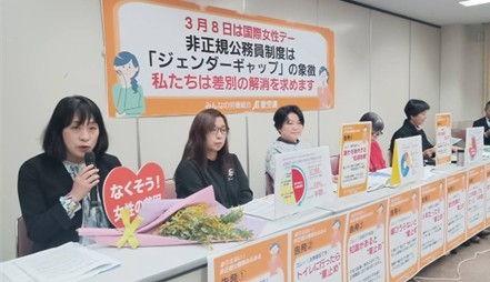 愛労連非正規公務員1万人組織化プロジェクトは「国際女性デー」を前に3月6日(金)、労働会館本館で「非正規公務員制度はジェンダー不平等の象徴、ジェンダー差別・不合理な格差の改善を求める」記者会見を行いました。朝日新聞・中日新聞・しんぶん赤旗、オンラインでNHK、ジャーナリストの小林美希さんが取材しました。